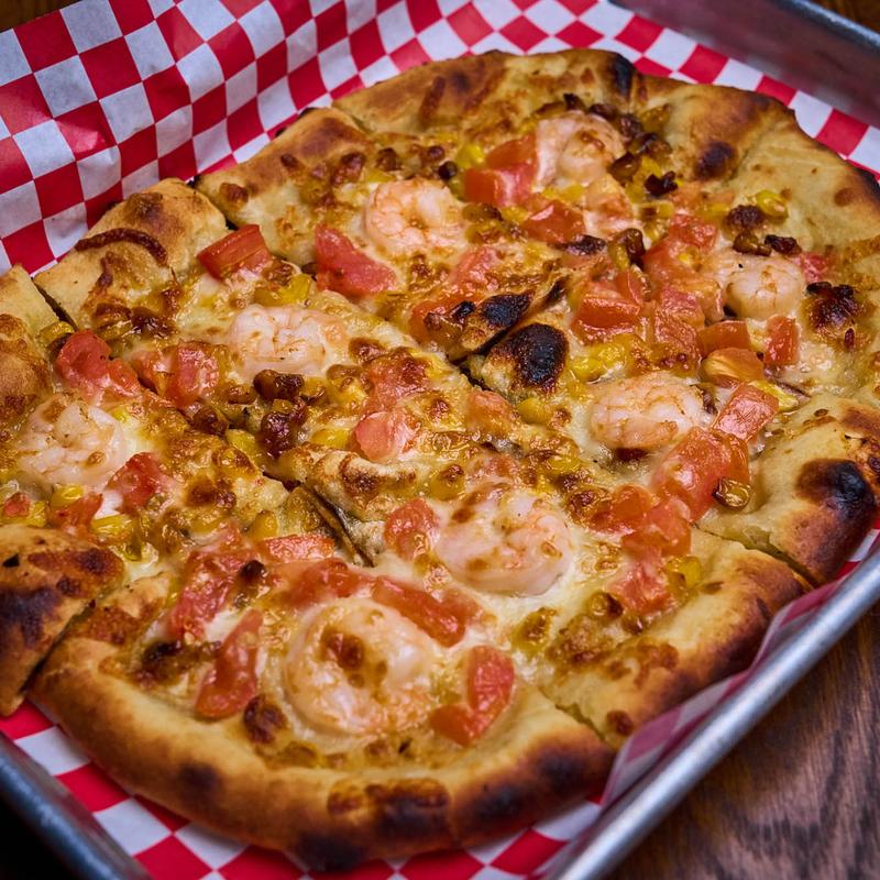 Corn, tomato, shrimp, mozzarella, & cheddar.