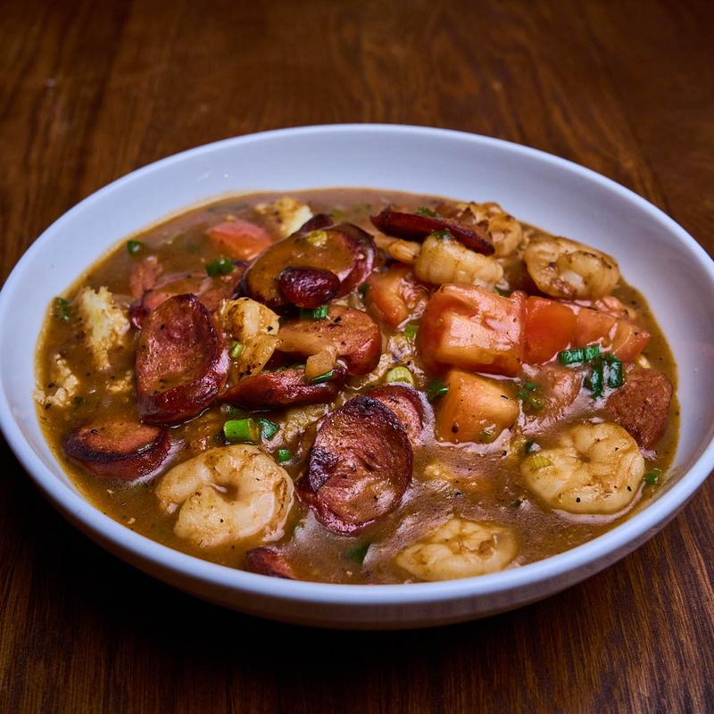 Crispy or Roasted Shrimp, cheesy grit cake, tomato gravy, scallion, & andouille sausage.