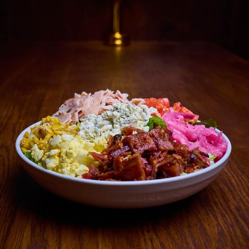 Turkey, bacon, egg, tomato, cucumber, red onion, corn, bleu cheese, & ranch.